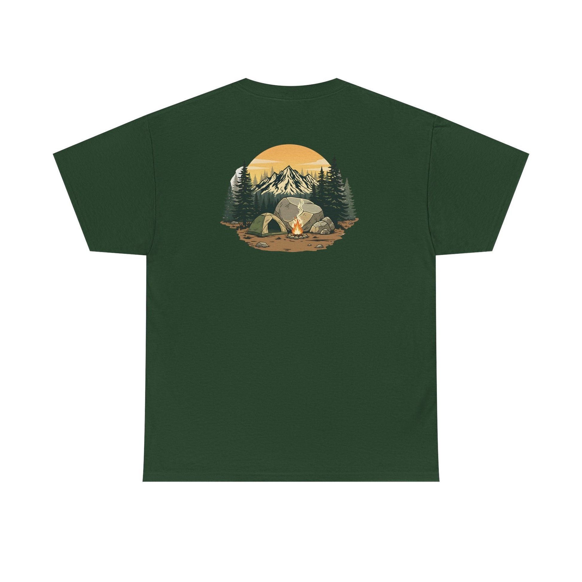 A soft, sturdy tee that brings the quiet of the woods straight into everyday wear. The front bears a small, detailed emblem while the back opens into a wide, warm scene: a campsite framed by pines, a glowing sunset and distant mountains. It sits comfortably on the shoulder, holds its shape after repeated washes, and feels familiar the moment you put it on. Wear it after a weekend under the stars, on a morning coffee run before a day-hike, or layered under a flannel for an evening by the fire it reads like a companion for people who carry the outdoors with them in small, thoughtful ways.