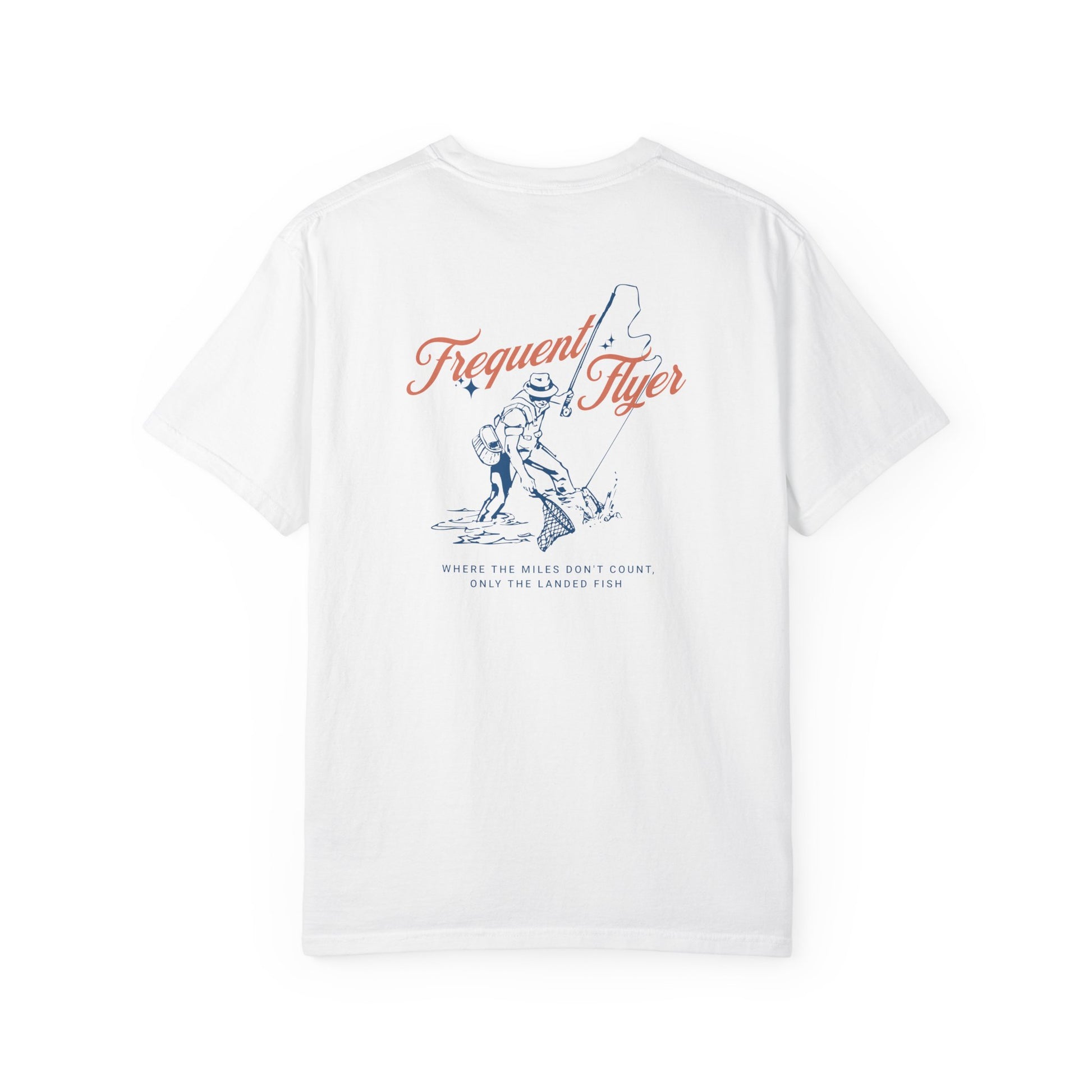 This fly-fishing t-shirt features a fly on the front and back, with a man catching a fish using a fly rod and net. The bottom text reads 'Where the miles don't count, only the landed fish'. Perfect for fishing enthusiasts who appreciate the art and challenge of fly-fishing. Ideal for wearing on fishing trips, outdoor adventures, and casual outings. Great for Father's Day, birthdays, and any occasion for fishing lovers.
