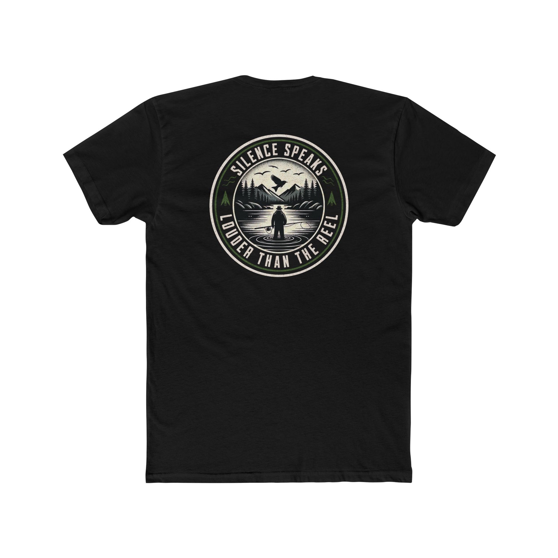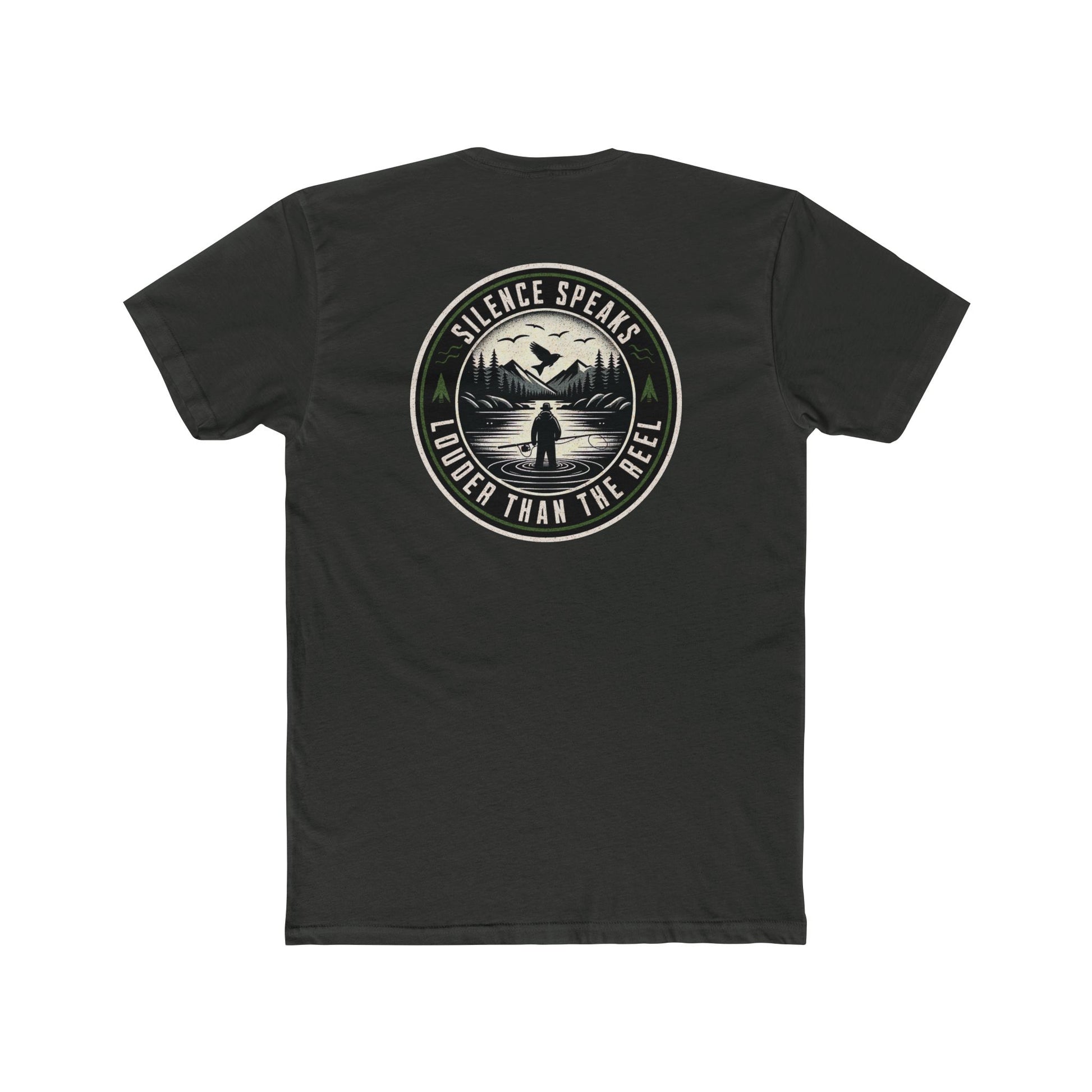 Silence Speaks Louder Than the Reel a fly-fishing t-shirt for those who find peace where the water meets the trees.
