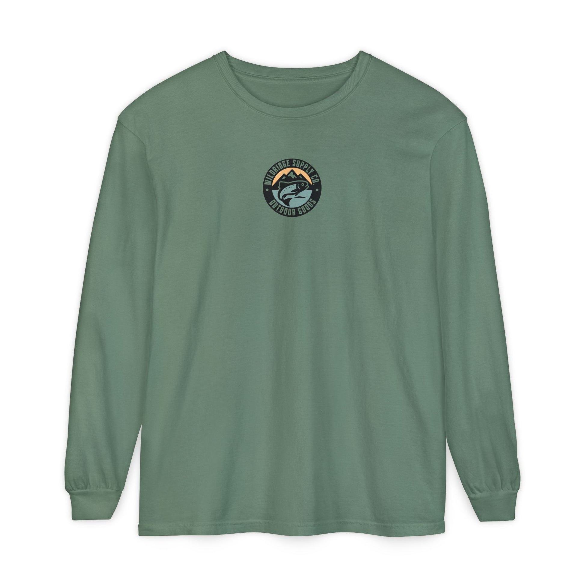 Vintage-inspired long sleeve t-shirt featuring a lone fisherman on a lake with a sunset design. Gives off a peaceful and nostalgic vibe, perfect for nature lovers and outdoor enthusiasts. Ideal for casual wear or as a thoughtful gift for fishing enthusiasts and those who appreciate serene sunsets. Relevant for Father's Day, birthdays, and summer outings.