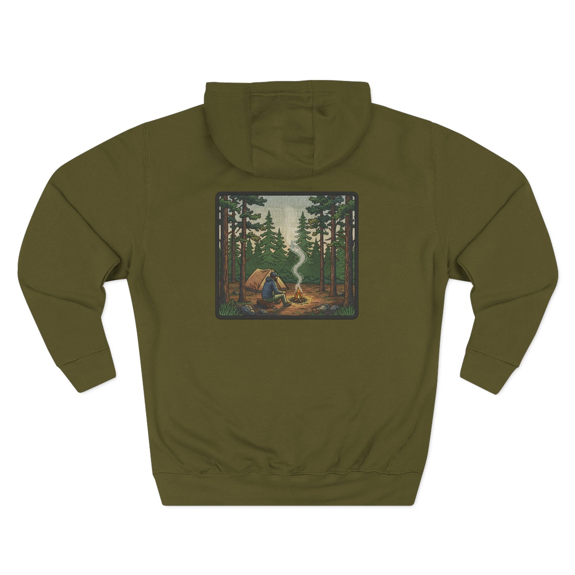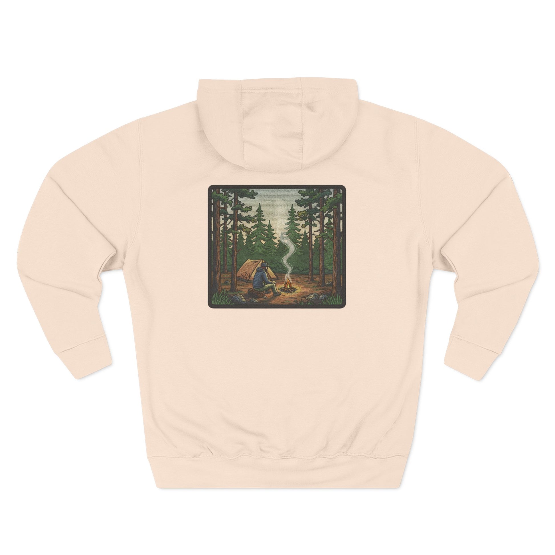 Back graphic: stitch-look campfire square badge with tent, pines, and rising smoke